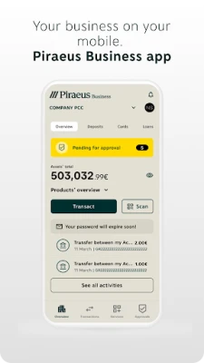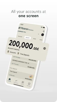 - Execute transfers between corporate accounts, transfers within Piraeus Bank (QR code/barcode scanning) or to other banks, bill payments and card payments within Piraeus Bank with Quick Login authentication (4-digit PIN, fingerprint or Face ID for compatible devices).