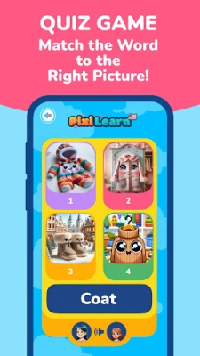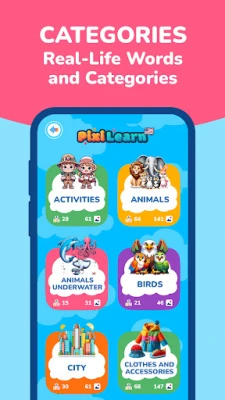 The app includes a learning module (PixiSchool) and 6 interactive games to make English learning fun: