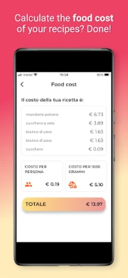 Oggi giorno calcolare il food cost delle tue ricette è diventato fondamentale. Ecco perché abbiamo integrato questa funzionalità in Pocket Chef. Una volta salvata la ricetta, basta solo un click per conoscere il prezzo totale della ricetta, per persona e per kg. Il tutto, calcolando il prezzo degli ingredienti che tu hai inserito nel "Prezzario".