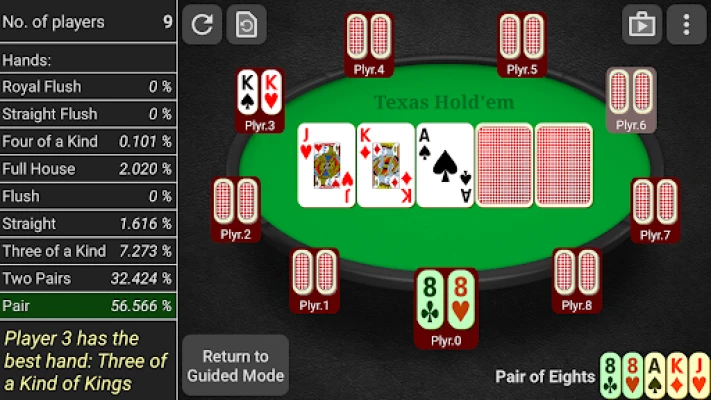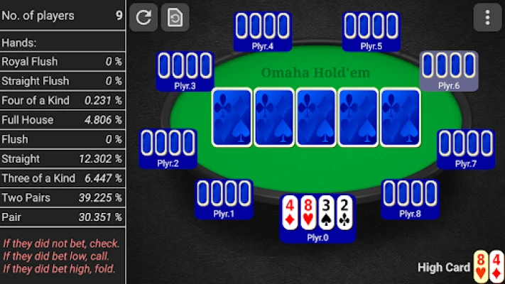 Two operating modes are offered: - Guided Mode: This mode shows instructions to be followed while playing a real game in the lower left box for every betting round (red text). - Best Hand Mode: This mode will be accessed at the moment you set a card of another player and will indicate the best hand among all the players with known cards in the lower left box (yellow text).