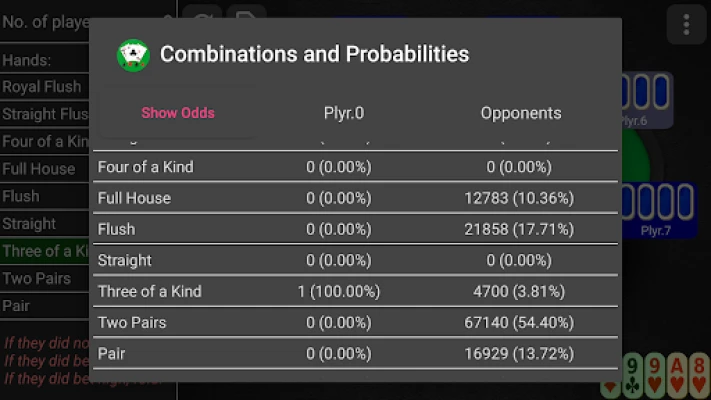 "Poker Statistics" shows the probabilities of reaching the last round (showdown) of a Poker game with each of the possible classic official hands of Poker games.