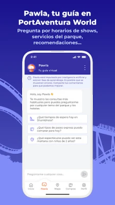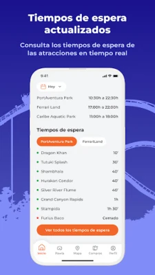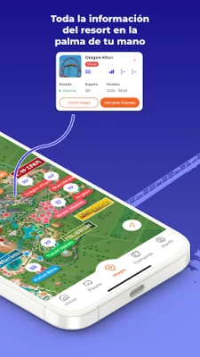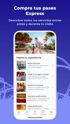· Consulta tiempos de espera en tiempo real y planea tu recorrido en el mapa, podrás crear rutas para llegar fácilmente de un punto a otro del parque gracias a la geolocalización. · Revisa horarios de espectáculos para no perderte nada y reserva asientos preferentes para tus espectáculos favoritos. · Planifica tu pausa para comer, reservando mesa en un restaurante o pidiendo comida para llegar y recoger. · Compra Pases Express y guarda tus entradas y pases en tu perfil para mayor comodidad.