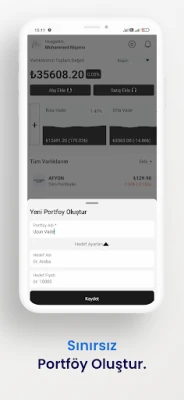 Sınırsız ve ücretsiz olarak oluşturabileceğiniz portföylerinize, istediğiniz varlıkları ekleyin ve takip edin. Hisse Senedi, Döviz(yakında), Altın(yakında), Gümüş,(yakında) Kripto Para(yakında), Fon(yakında) gibi bir çok varlık bulunmaktadır. Diğer bütün varlıkların eklenmesi için hergün uygulamayı geliştirmeye devam etmekteyiz.