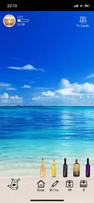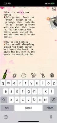 How to create a bottle: Touch the “beach” button to go to the beach ,then touch the “write” to create a new bottle. You can choose your favorite letter paper and bottle here, then write what you want to say.