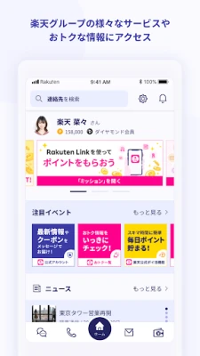 あなたのお気に入りのサービスだけでなく、楽天モバイルご契約者様限定のキャンペーンやおトクな楽天サービスに簡単にアクセスいただけます!通話やメッセージの機能をはじめ、データ利用量や利用料金の確認、楽天ポイントが毎日貯まるRakuten LinkのSuper Point Screen、その他にも様々な楽天グループのサービスをホームからご利用いただけます。