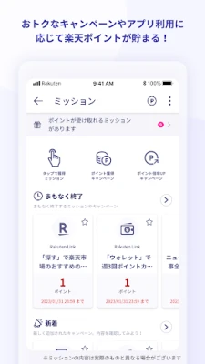 ■ミッション:おトクなキャンペーンやアプリ利用に応じて楽天ポイントが貯まる!