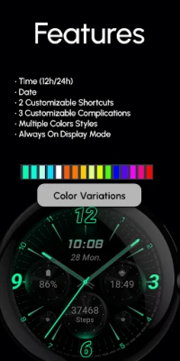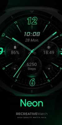 Neon-inspired Watch Face with realistic effects and a true black background, designed for Wear OS. Perfect for a sleek, modern look that makes the neon elements pop on your wrist.