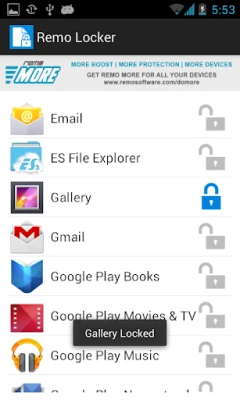 This app provides single tap Toggle app status to lock and unlock and also gives the separate options to lock audio, video, images and files by hiding them. In order to access them after locking, the user has to provide the Master password.