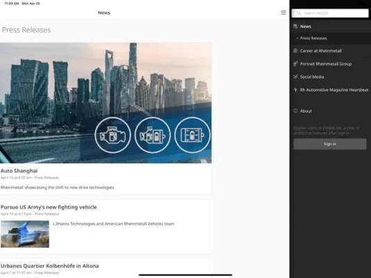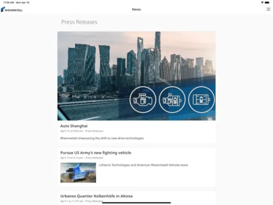 The Rheinmetall INSIDE app offers news and information about Rheinmetall. In addition to a company portrait, you will find current press releases. The app also provides access to the Rheinmetall career portal as well as Rheinmetall's social media channels. After logging in, additional functions are available to authorised users.