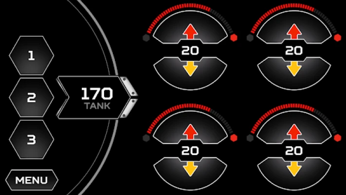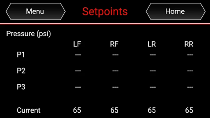 From the main screen one can individually control each air spring, select from 3 presets, access the menu system, view tank pressure, air spring pressure and level sensor bar graphs.