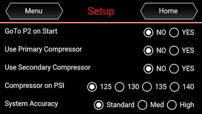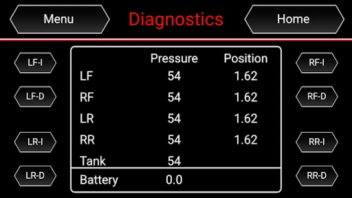 The menu system provides an intuitive experience that allows the user to set features such as auto level on start, choose compressor trigger pressure, Calibrate the system, learn wireless devices, view errors, as well as a full diagnostics suite.