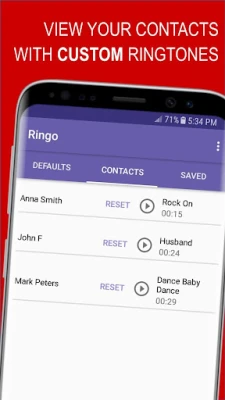 Our ringtones app shows which of your contacts have special ringtones (not set to the default ringtone) and allows you to change them or reset them to your Android phone's default ringtone directly from the app.