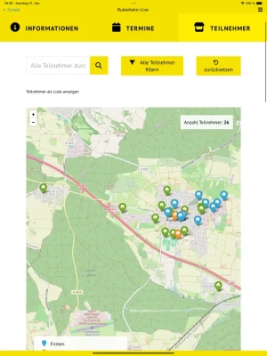 Interaktive Teilnehmerkarte: Entdecken Sie auf einer übersichtlichen Karte alle Teilnehmer – Rathaus, Schulen, Unternehmen und mehr. Navigieren Sie einfach durch die Stadt, indem Sie Kategorien filtern und schnell finden, was Sie suchen.