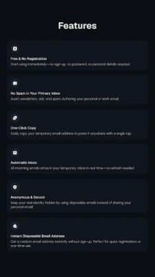 Auto-Expiry: Temporary email addresses self-destruct after a set period, ensuring your privacy.