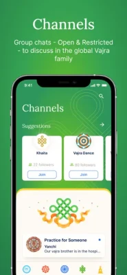 There's a new, long-awaited section offering group chats. Practitioners can instantly ask, advise, share and discuss topics with the global Vajra family (PC access from mahasangha.net included). Individuals can create their own channel on any topic, as needed. The channel can be public to everyone on the app or restricted to invited participants only. This is a dedicated online space for information and discussions about the Teaching - all held privately and securely within the Dzogchen Community, out of commercial social networks.