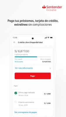 i. Consulta el Estado de Cuenta de tu Tarjeta de crédito y el cronograma de pago de tu Préstamo. ii. Paga tus Préstamos, Tarjeta de Crédito, Extralínea y Línea paralela. iii. Recibe y envía dinero al toque solo con tu número de celular a billeteras digitales y otras entidades. iv. Utiliza el CVV dinámico para mayor seguridad en tus compras online. v. Autentica tus operaciones con un nuevo factor de seguridad mediante notificaciones push. ¡Descárgala ahora! Es el momento de hacer tus operaciones más simples con Santander Consumer.