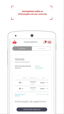 O aplicativo Santander Financiamentos é o seu canal de atendimento digital na palma da mão, onde e quando quiser. Ainda não é nosso cliente? Escolha “Quero um Financiamento”, faça a simulação, envie uma proposta e acompanhe todas as etapas online.