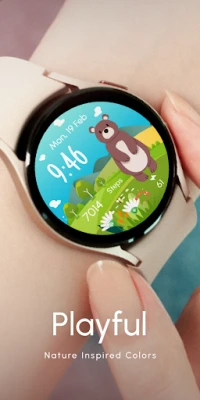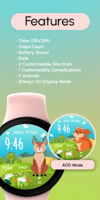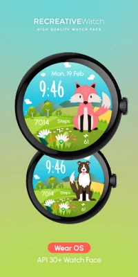 Wear OS Watch Face with spring and summer heralding animals 🐰 Bunny, 🐤 Chick, 🐑 Lamb, 🦊 Fox, 🐶 Dog, 🐱 Cat, 🐻 Bear, 🐿️ Squirrel, 🦌 Deer, set against a splendid mountainous nature landscape 🌄🌿. Perfect for seasons like spring and summer.