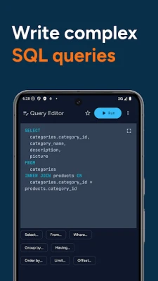 - Write SQL queries using the mobile-friendly SQL editor, or write SQL queries manually.