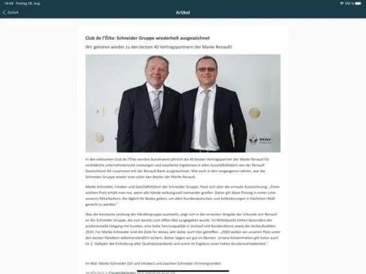 Die SGapp ist die Kommunikations-App der Schneider Gruppe GmbH. Im öffentlichen Bereich bietet sie wichtigste Informationen zur Schneider Gruppe sowie News zu deren Entwicklung. Sie richtet sich an Mitarbeiter, Kunden und Interessenten, die sich einen generellen Überblick über das 1977 gegründete Automobilunternehmen mit Hauptsitz in Chemnitz verschaffen wollen.