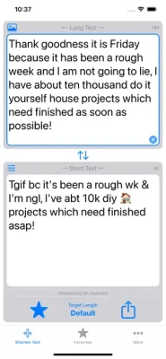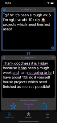 Have you ever needed an easy way to shorten messages? Do you ever get confused by abbreviated words or internet slang? Maybe you have a unique style of shorthand that you wish you could share with friends? The Short Text app is your solution for these and many other short text needs!