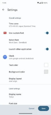 Features Custom Time zone Custom Background color Custom font (for Pro user) Custom label, text size and color Set application shortcuts by tapping clock