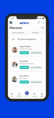 2) Navigate to ‘Set Sphere Suggestions’ on the central S button and select your preferences. Sphere App will do a lot of the thinking for you when it comes to networking, working hard in the background to suggest relevant users that we think you'll benefit from connecting with. So make sure to spend a bit of time setting up your preferences so we can make our suggestions as helpful as possible.