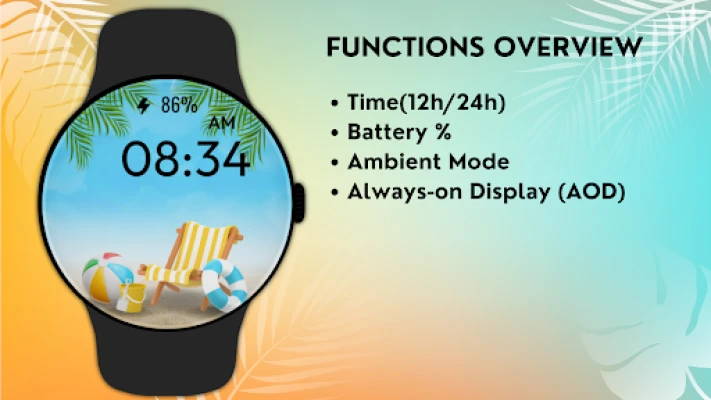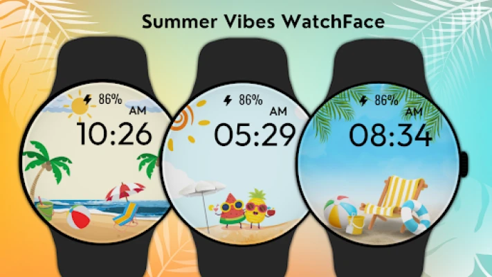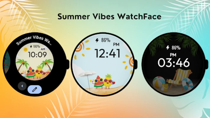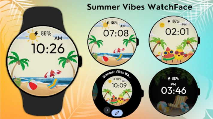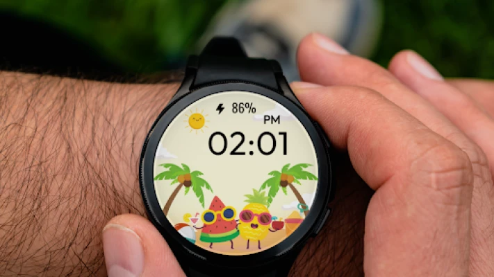 Bring sunshine to your wrist with the Summer Vibes Watch Face—a vibrant and playful Wear OS design featuring cheerful fruit characters, palm trees, and a sunny beach backdrop. Perfect for summer lovers, this watch face delivers a fresh vacation vibe while keeping you informed with all essential data.