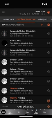 - Fotoğraf Fırsatları - çekim fikirlerine ilham olması için kritik zamanların interaktif bir listesi; gökyüzünde alçakta parlayan dolunay, yıldız gözlemi için tam karanlık ve daha fazlası