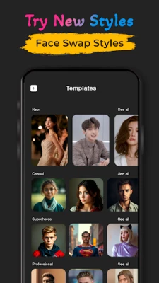 • Template-based Face Swaps: Choose from a variety of templates to quickly swap faces with celebrities, fictional characters, or others.