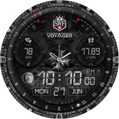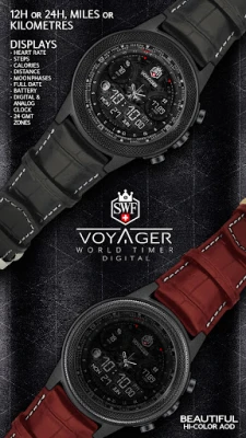 The SWF Voyager digital watch face presents itself with a extraordinary, timeless and elegant swiss design that shows you the local time with 24 GMT* time zones and most smartwatch information on your wrist in a clear and concise way.