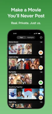 Taps are private video stories, made in one tap. Not for everyone. Just us. You film. Your people film. TapYou blends it all into one seamless movie. No editing. No sending. No effort. Just magic.