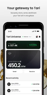 Tari Universe Wallet is a beautifully designed and easy-to-use self-custody cryptocurrency wallet for Tari tokens (XTM). Safely manage your portfolio, track your real-time mining earnings, and send and receive XTM tokens with ease.
