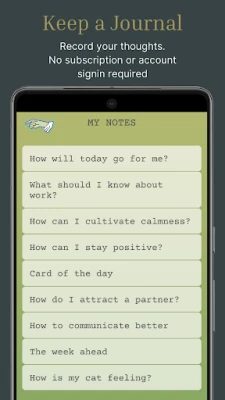 Okumalarınızı Bir Günlüğe Kaydedin: Tüm tarot okumalarınızı özel bir günlükte tutun. Büyüdükçe notlar, düşünceler ekleyin ve girdilerinizi yeniden ziyaret edin.
