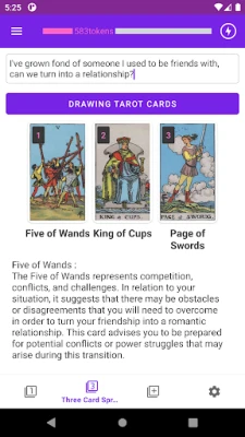 Tarot Card Interpretations: The app selects the appropriate Tarot cards based on the user's questions and provides detailed explanations of their meanings. Users can gain insight into their situations and futures through the messages conveyed by the Tarot cards.