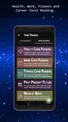 This app also provides a lot of tarot reading predictions like Finance Tarot Reading, Past Present Future tarot, most popular tarot spreads, Tarot Spinner game etc.