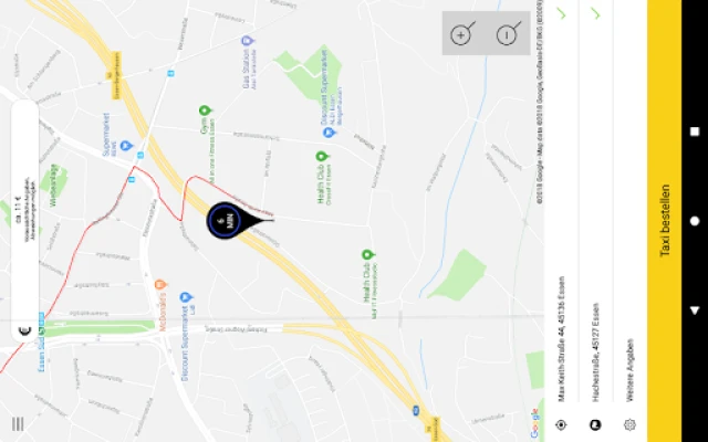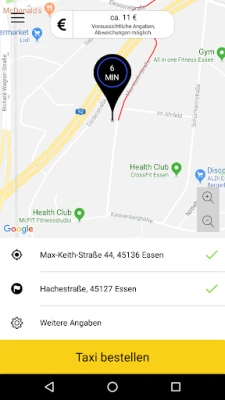 Sie erhalten eine Bestellbestätigung und können jederzeit den genauen Status Ihrer Bestellung einsehen (wie z.B. die Dauer der Anfahrt Ihres Taxis). Es werden sogar Ihre voraussichtlichen Kosten bis zum Ziel angezeigt (Taxitarif der Stadt Essen).