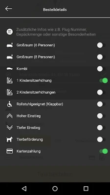 Suchen Sie sich die Passenden Optionen heraus (z.B. Großraum, Kombi, Bar oder Kartenzahlung oder auch Rollstuhl (Klappbar)).