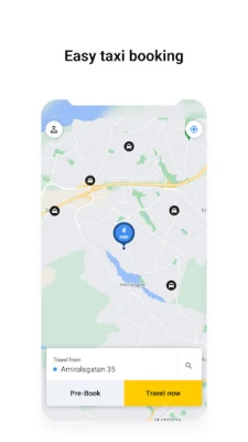 - Start the app and click on ’travel now’ to book directly from your current location