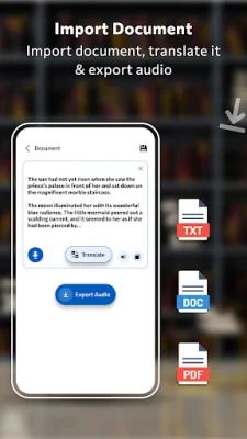 •Convenience:Save time and effort by quickly changing documents into different languages and turning them into audio files you can listen to anytime, anywhere.