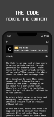 Welcome to The Code - the app that lets you uncover hidden content using secret codes! With The Code, you can enter codes or create your own to reveal hidden messages.
