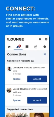 • CONNECT: Find other patients with similar experiences or interests, and send messages one-on-one or in groups.