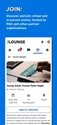 Welcome to The Lounge at MSK! The Lounge is a safe and protected social network app for teen and young adult patients (ages 18-39) at Memorial Sloan Kettering Cancer Center. Here you can connect with other MSK patients and survivors to share stories, find support, and learn about events and resources near you.