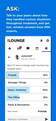 • ASK: Talk to your peers about how they handled various situations throughout treatment, and get fast, reliable answers from MSK experts.