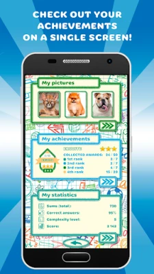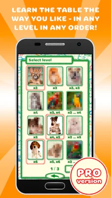 36 workouts are split into several levels from simple to complex. The first level starts with the simple multiplication by 2 and the last ends with complete multiplication table. There are 11 levels to learn multiplication table and 25 levels to repeat it (with a possibility to include division sums). Every level increase next task complexity.
