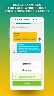 Each English word in this TOEFL vocabulary builder app is pronounced by native American English speakers so you can immediately perceive the speech by ear, which is very important for the TOEFL Listening module. Because of unique learning technique you will keep in mind the correct spelling of English words forever, which will also increase your band in the TOEFL Writing module.