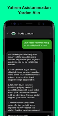 Yapay zeka destekli yatırım danışmanı ile sohbet ederek kişiselleştirilmiş yatırım önerileri alın. Kripto, forex ve hisse senedi piyasalarında stratejilerinizi iyileştirin, riskleri yönetin ve işlemlerinizi optimize edin.