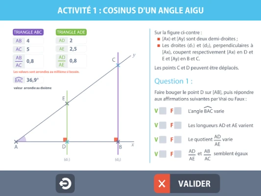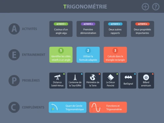Trigonométrie est une application compagnon pour le collège et la classe de seconde : Elle comprend des activités d’introduction des différentes notions, des exercices d’entrainement ainsi que différents problèmes.