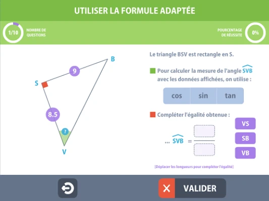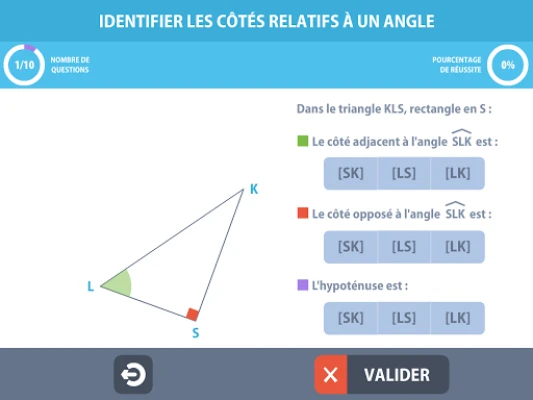 Le dernier exercice est paramétrable : Nombre de questions, choix des lignes trigonométriques, calculs de longueurs et/ou d’angles.