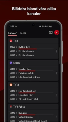 Med nya TV4 Play kan du streama svenska och internationella filmer och serier, nyhetssändningar, populära program, kanaler och sport i världsklass. Logga in med ditt gratiskonto för att få tillgång till TV4:s klassiska utbud eller med ett uppgraderat konto för att få ännu mer innehåll.
